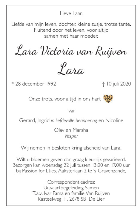 Van de kant van dailycool in warmenhizen wensen we jullie heel veel sterkte met dit grote verlies lara van ruijven. De verzorging die lara krijgt is uitstekend, maar haar toestand blijft zorgwekkend.